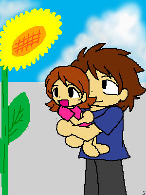 夏です。 ルイが一生懸命育てたヒマワリは、お父さんの背丈も 超えてしまいました。 夏空に黄色がよく映えています。