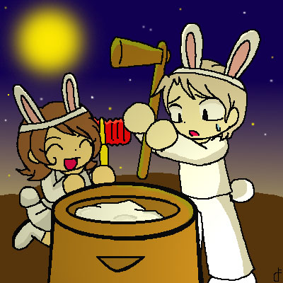 秋です。 お団子を作るため、お餅をついています。 「何で僕がこんなこと…。」とブルースは困り顔ですが、 ルイは相変わらずにっこにこです。