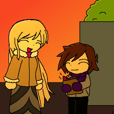 冬です。 キレイな夕焼け空と、ほっかほかの焼き芋に、 学もユキも暖かそうです。